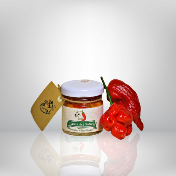 Crema di peperoncini Scorpion rosso e Naga Morich, due varietà tra le più piccanti al mondo. Gusto esplosivo e profumo intenso, per chi ama sfidare il fuoco in cucina.